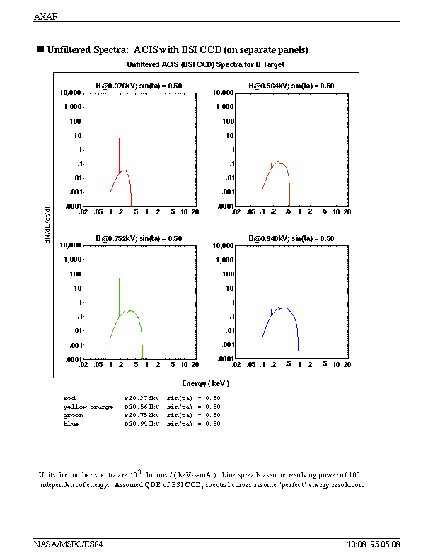 Set 1: K-edge group, unfiltered. Target Voltages (kV): 0.376 0.564 0.572 0.940 PEIS Source Model: table plot1 plot2 At Focal Plane: table plot1 plot2 ACIS, Backside-Illuminated: table plot1 plot2 ACIS, Frontside-Illuminated: table plot1 plot2 HRC, CsI MCP + UV shield: table plot1 plot2